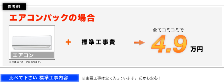 おまかせ!でんチュ〜くんでは、エアコン・オール電化など現場調査をしなければわからない工事に関しても、商品代+工事費を入れた全てコミコミの「安心パック価格表示」にしています。